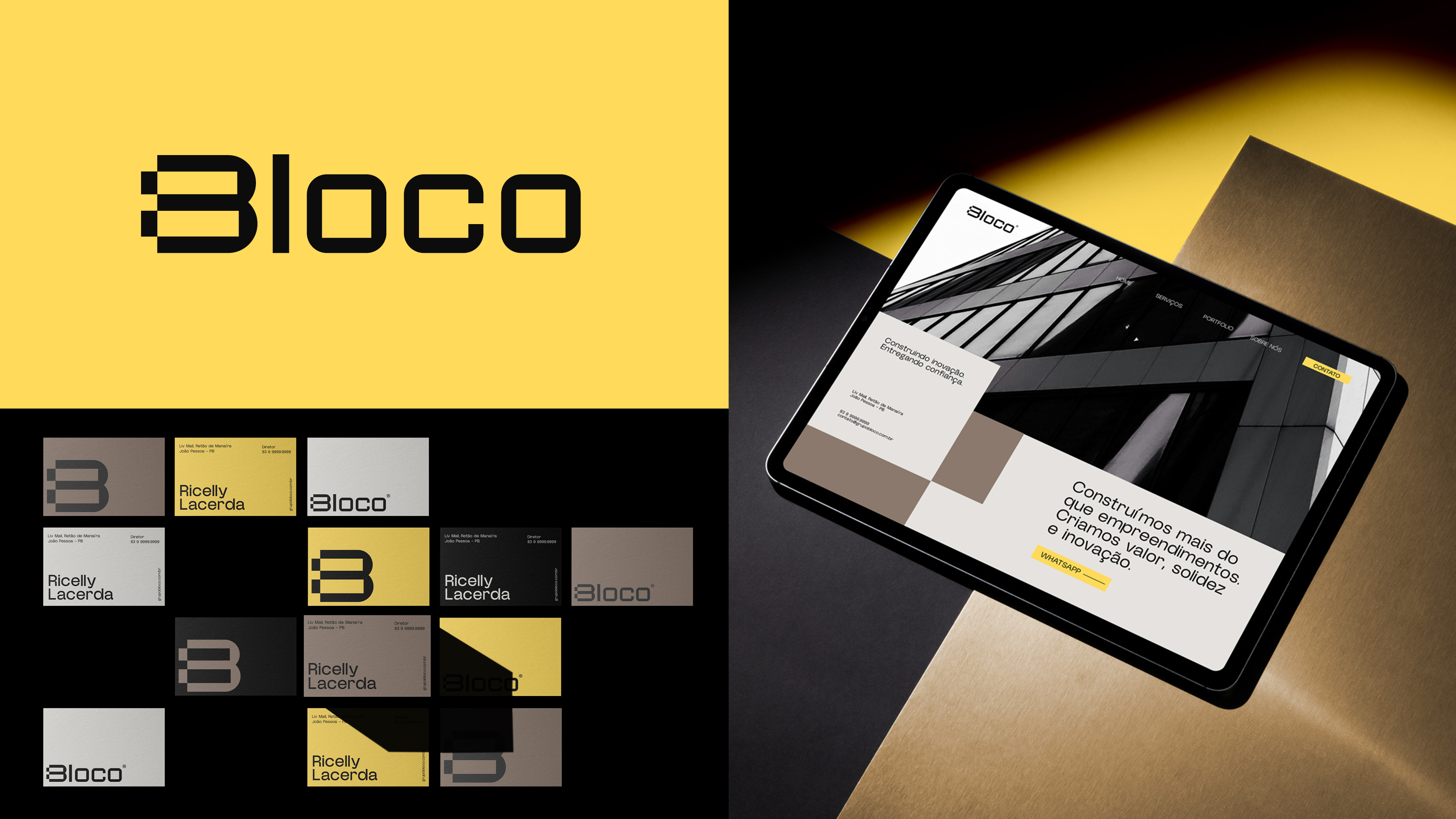 BLOCO é uma construtora que se apresenta como uma marca que desafia padrões e transforma a complexidade do setor imobiliário em soluções ágeis, seguras e eficientes. Seu propósito está em reimaginar processos e entregar excelência em cada detalhe, sem abrir mão da inovação e da autenticidade que a tornam única no mercado. Sua identidade visual traduz essa essência com clareza. O amarelo, como cor central, simboliza energia e confiança, enquanto o logotipo robusto e a tipografia geométrica reforçam solidez e modernidade. Mais do que uma marca, a BLOCO é a materialização de um novo olhar para o futuro da construção e das relações imobiliárias.