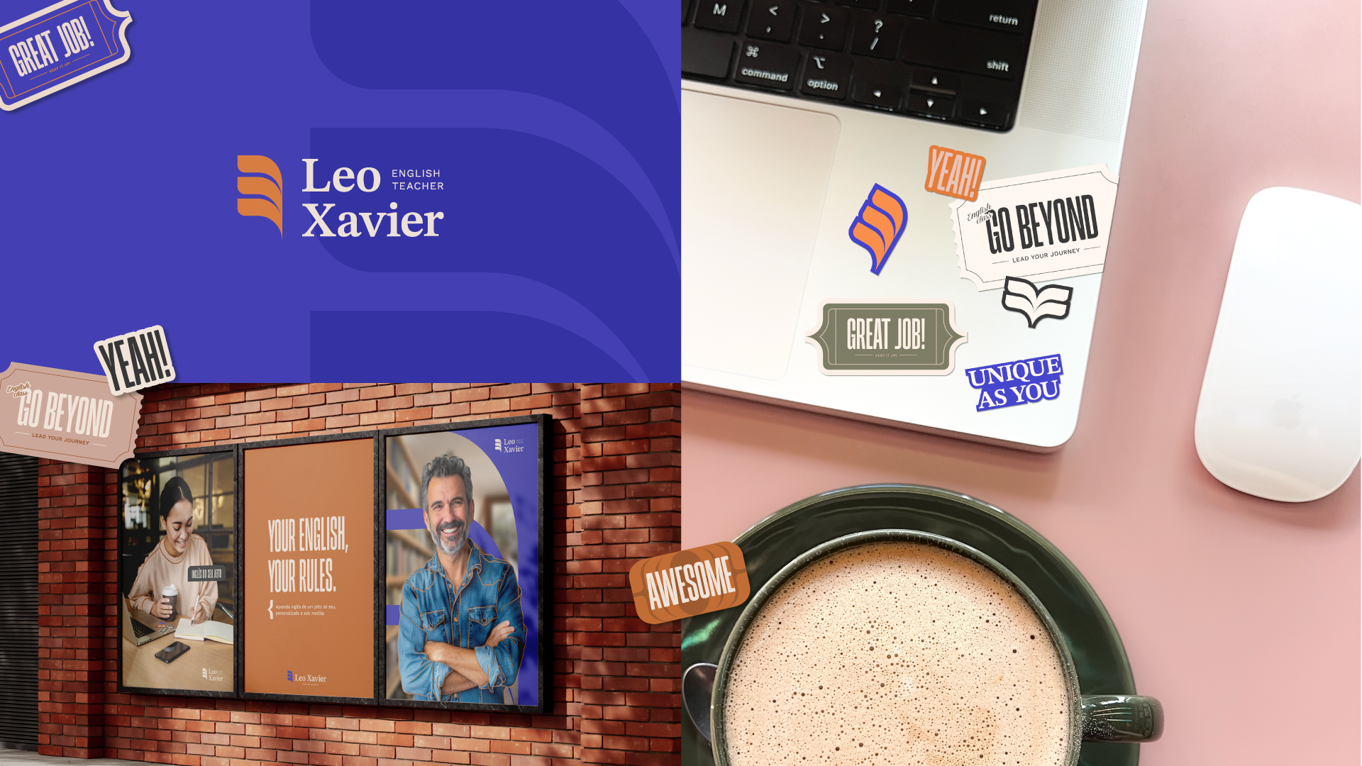 Preocupando-se em deixar o inglês mais íntimo e acessível para a realidade linguística e autenticidade de cada aprendiz, o professor Leo Xavier engaja seus alunos de forma personalizada e direcionada. A identidade tem como objetivo se diferenciar do segmento "aulas de inglês" juntando elementos tradicionais e modernos em uma comunicação vintage. A paleta colorida deixa de lado os clássicos branco, vermelho e azul para dar lugar a uma combinação estratégica versátil e inusitada, moderna. O símbolo soma o conhecimento transmitido pelo professor (raios de luz) e o estudo do aluno (livro), resultando na asa. Com o cumprimento das partes é possível então atingir os objetivos desejados e alçar vôo rumo a um brilhante futuro bilíngue.